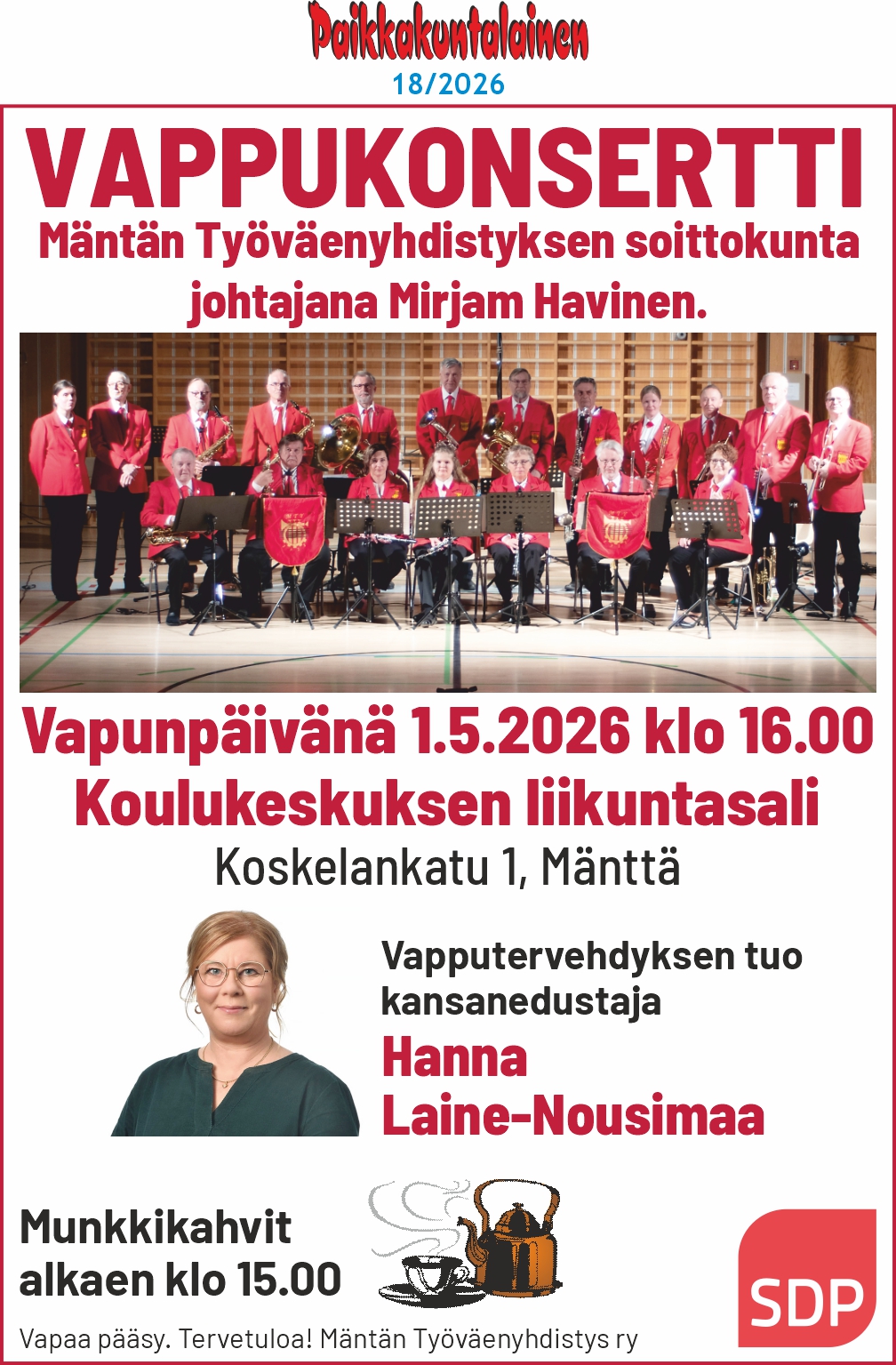 Mäntän Työväenyhdistyksen Soittokunnan vappukonsertti. Vapputervehdyksen tuo kansanedustaja Hanna Laine-Nousimaa. Ei pääsymaksua. Kahvitus alkaa klo 15.00